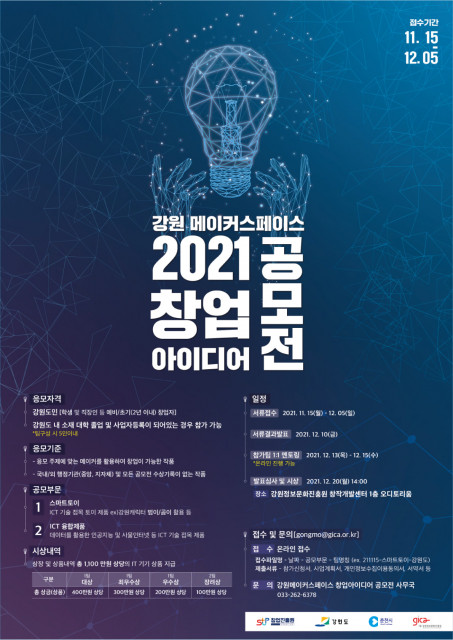 서류 접수 기간은 2021년 12월 5일(일)까지며, 서류 평가 및 외부 전문가 멘토링을 진행한 뒤 12월 20일(월) 오후 2시 강원정보문화진흥원 창작개발센터 오디토리움(예정)에서 최종 발표 및 시상식이 진행될 예정이다. 시상 내역은 총 1100만원 상당의 IT 기기로 총 5팀(대상 1팀, 최우수상 1팀, 우수상 1팀, 장려상 2팀)을 시상한다.