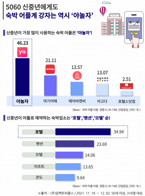 시니어 소셜벤처 임팩트피플스(대표 신철호)의 에이풀(Aful)을 통한 리서치 결과(조사기간 11월 19일~12월 2일, 50세 이상, 316명), ‘5060 세대의 숙박 어플 이용 트렌드’에서 ‘최근 1년 이내 숙박 어플 사용 경험’이 있는 신중년이 53.16%로 2명 중 1명은 숙박 예약 시 숙박 어플을 이용한 것으로 나타났다.