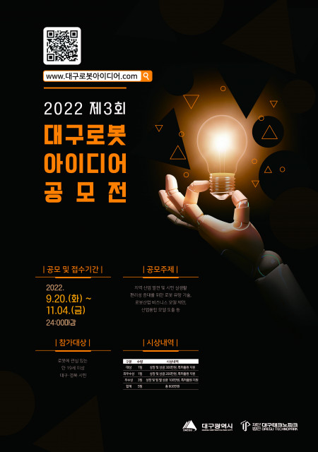대구시와 대구테크노파크가 지역 로봇 산업 창업 붐 조성 및 로봇 산업 역량과 생태계 강화를 위해 ‘제3회 대구 로봇 아이디어 공모전’을 개최한다.