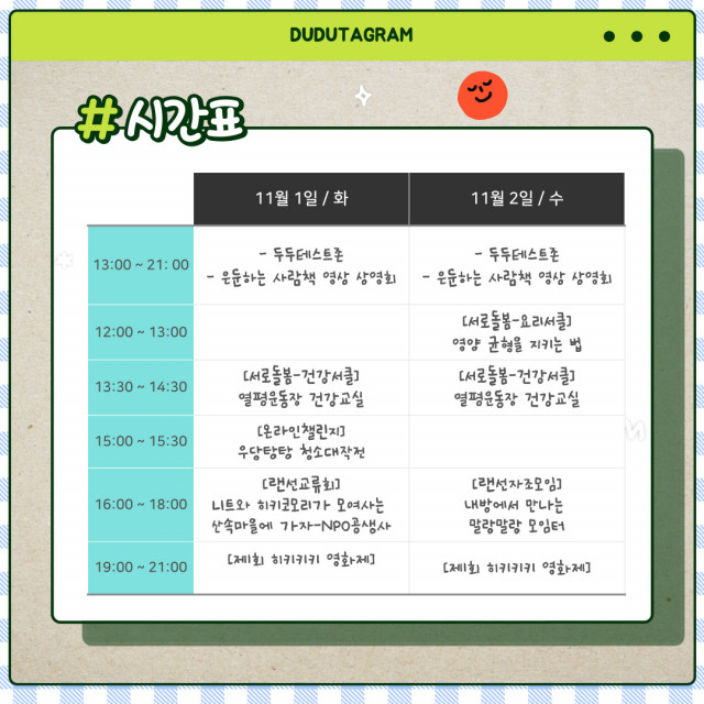 이번 행사에서는 두더지땅굴 플랫폼에서만 만날 수 있었던 두두테스트 등 기존 콘텐츠뿐만 아니라 오프라인으로 진행되는 자조모임, 서로돌봄서클 활동을 온라인 공간에서 생중계해 공간 제약이 없이 어디서든 참여할 수 있다. 방 바깥으로 나올 수 없는 은둔 상태에 놓인 청년부터 갈 곳도 만날 사람도 없는 고립 상태에 놓인 청년까지. 방을 나오지 않고도 또는 방을 나와서도 즐길 수 있는 콘텐츠를 제공한다.