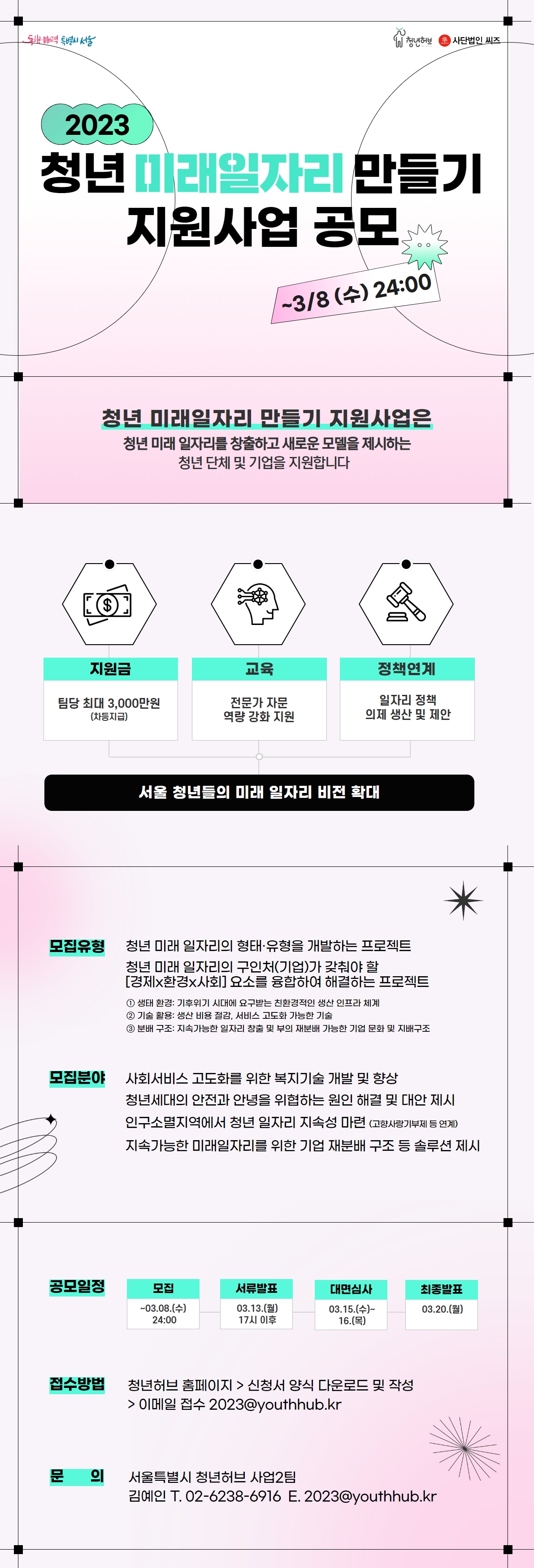 2023 청년 미래일자리 만들기 지원사업과 관련해 보다 자세한 사항은 청년허브 누리집에서 확인하거나 청년허브 사업2팀으로 문의하면 된다.